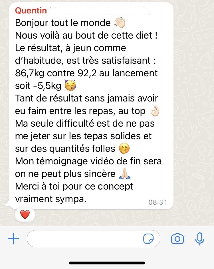 ❝ J'ai perdu une taille de pantalon et psychologiquement c'est enorme pour moi, et puis sans aller dans l'extrême, je veux allez au bout de mes objectifs (-15 kilos au total) et garder cette dynamique qui m'anime avec ce programme…❞