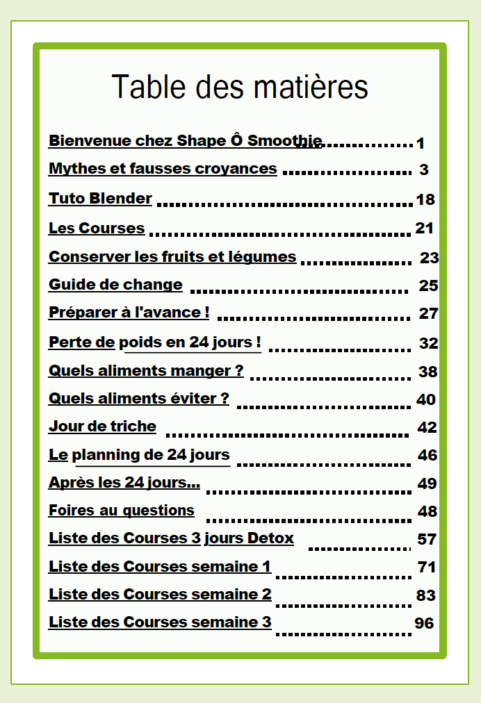 Ce programme n'est que le début d'une vie en meilleure santé et d'un corps plus mince. Le commentaire n ° 1 que je reçois est qu'après quelques semaines, les envies de sucreries et de malbouffe ont pratiquement disparu. Cela rend très facile de maintenir le poids. Je vous montre également exactement comment revenir à vos habitudes alimentaires habituelles après les 24 jours tout en incorporant des smoothies à votre alimentation pour maintenir votre poids. En fait, la plupart des gens aiment tellement les smoothies qu'ils ne veulent pas les abandonner après 24 jours ! Comme certains de mes clients l'ont dit, il s'agit d'un programme complet de transformation de mode et d'hygiène de vie